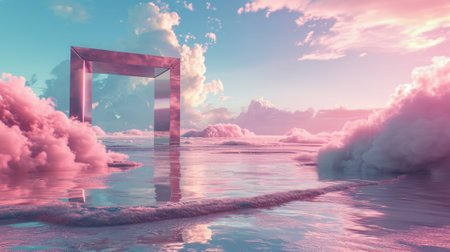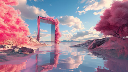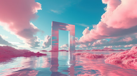 A metallic pink square portal in the middle of the clear river that connected to the ocean that surrounded with a pile of the pink sand and pink desert under the cloudy sky in the sunny day. AIGX03.