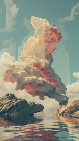 A large cloud with a red and white swirls is floating in the sky above a body of water