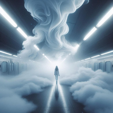 A mesmerizing scene featuring a mysterious figure emerging from fog, illuminated by soft light. The composition evokes emotions of solitude and exploration, inviting viewers to reflect on their own journey.