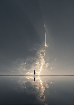 A person standing in the middle of a puddle on top of water, AI