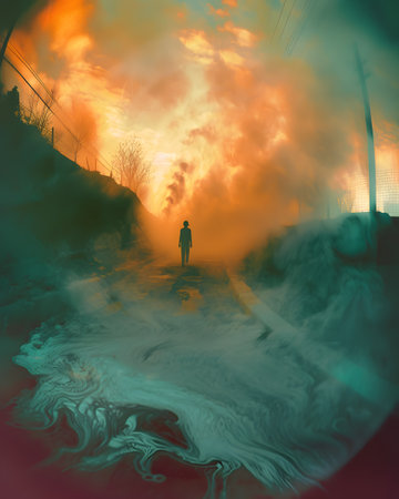 Lone figure in surreal scene against fiery sky, mysterious landscape