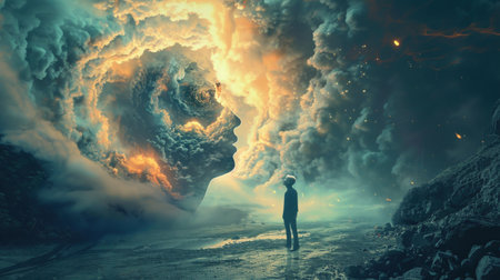 A contemplative man stands before a profile silhouette filled with a rugged mountain landscape, shrouded in mist. The surreal composition evokes introspection and the vastness of the inner self.