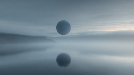 A serene landscape features a floating sphere above calm water, surrounded by mist at dawn, creating a tranquil and ethereal atmosphere perfect for artistic inspiration.