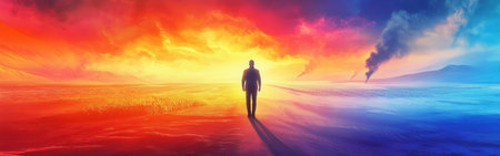 A man stands alone, silhouetted against a vivid sunset with a dramatic sky of fiery colors. The landscape features contrasting hues and distant smoke, evoking a sense of wonder.