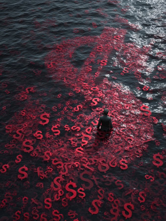 A person stands in shimmering water filled with floating red dollar signs, symbolizing financial challenges and uncertainties at dusk.