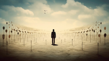 surreal conceptual image of a man standing under a single rain cloud in a wide open field at sunset. the scene symbolizes depression, loneliness, and emotional struggle.