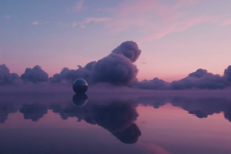 A metallic sphere rests on a still lake, mirroring a serene sunset sky.