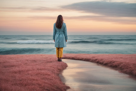 a woman standing on a slender platform, suspended high above the ground, in a surreal, minimalist environment. the image features a minimal color palette, emphasizing the stark contrast between the figure and the surrounding space. it evokes isolation, contemplation, and the exploration of one's existence within a vast and empty universe. ai generated