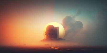 A science fiction graphic design concept of a glowing portal. With a mysterious figure mirrored in a misty spooky landscape at night.