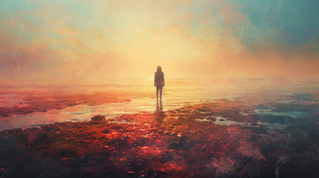 A person looks toward a soft glowing horizon during sunset, surrounded by a reflective surface that enhances the colors of the sky.