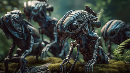 Four eerie alien models huddle together in a mysterious, woodland landscape