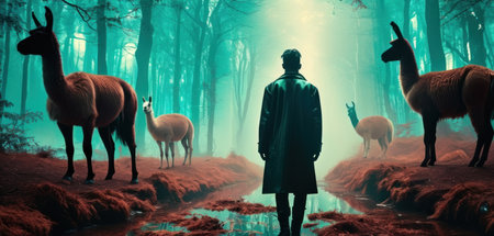 Man in the misty forest with llamas. 3D rendering