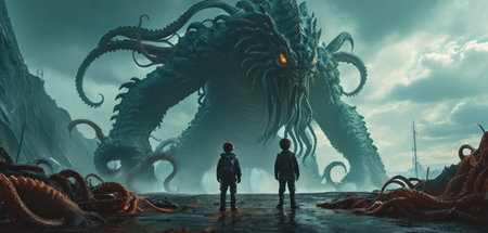 giant horror monster artwork featuring a hyper-realistic sci-fi style. this dark gray and red wallpaper, available for download on iphone, showcases a bulbous creature in a muted seascape setting. with elements of lowbrow and harsh realism, this 32k uhd image is perfect for those seeking a visually striking and eerie background. ai generated