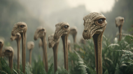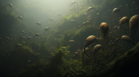 Close-up view of numerous tall, plant-like creatures with distinct heads and stems, emerging from a dense, foggy forest. The creatures appear to be alien or otherworldly in design, with detailed textures and shapes, giving an impression of ancient life forms.