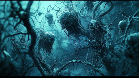 A chilling scene of human skulls entangled in gnarled, bare branches, bathed in a cool, moody blue light, creating a haunting and surreal horror landscape.