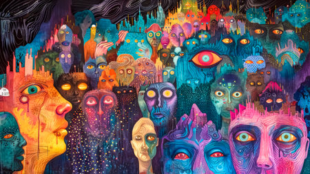 Vibrant surrealistic mural with eyes and faces