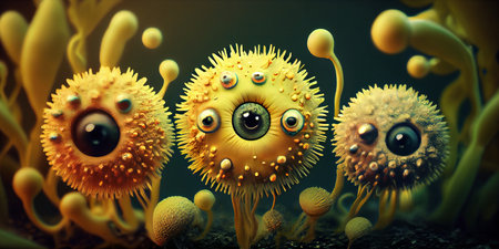 A group of chaotically surreal bacteria with a face. cartoon picture