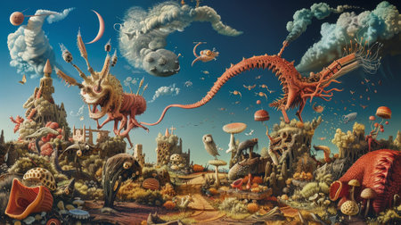 Bizarre creatures and fantastical landscapes populate a surreal dreamscape backdrop
