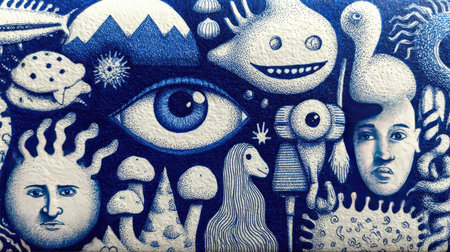 This captivating blue ink drawing showcases a blend of surreal elements, including an eye, abstract faces, and whimsical creatures, creating an intricate visual narrative.