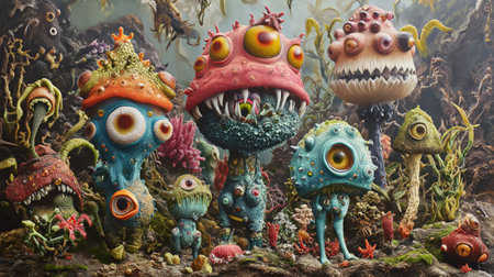 Terrarium with colorful fantasy monsters of abstract appearance