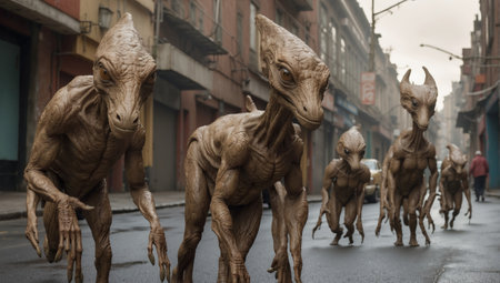 Fantasy alien monster 3d illustration. Fantasy alien creature in city.
