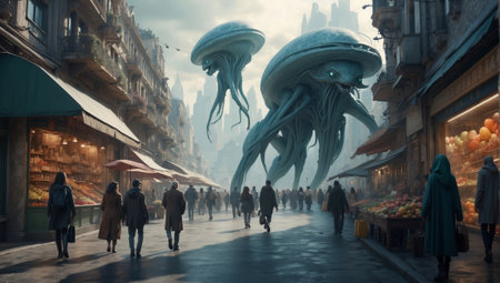 Crowded street in Paris with giant jellyfish. 3d rendering