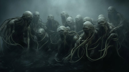 the malevolent spirits, surrounded by an eerie aura, are being forcefully dragged to the dark depths of the ocean by a taut rope, evoking a sense of cinematic realism, as if plucked straight from a horror movie, with the turbulent waters and ominous atmosphere amplifying the sense of dread and foreboding. ai generated