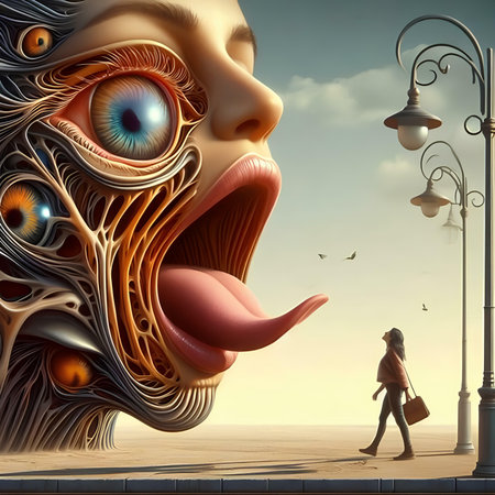 Surrealistic 3D illustration of a woman looking at a giant monster