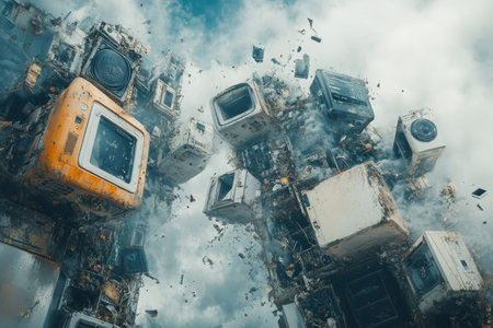 Electronic waste, old computer parts, recycling, with a burning city background