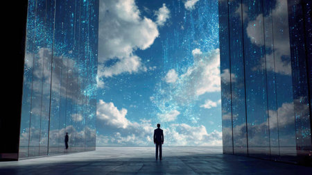 Silhouette of a businessman standing in front of a futuristic glass wall