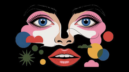 A striking portrait of a woman is set against an engaging backdrop of bold colors and abstract shapes. The artwork combines modern elements with vibrant details.