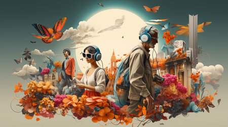 an abstract photo collage featuring a person standing before a picturesque lake and mountains. this artwork combines elements of floral surrealism, mid-century illustration, and japanese-inspired art. the multi-layered color fields create a collage-esque effect, while also depicting urban life. this captivating collage artwork showcases a unique blend of styles and themes. ai generated