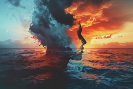 Abstract representation of a persons silhouette merged with ocean waves and a sunset horizon