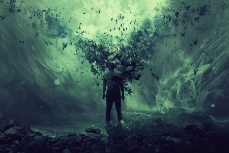 surrealistic image of the concept of loneliness in which a person is alone on the water surrounded by rocks and flying birds