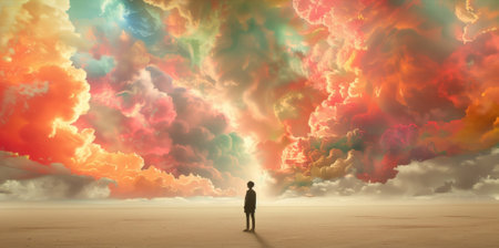 A person stands beneath a surreal, colorful sky, evoking awe and wonder