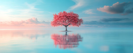 Solitary pink tree reflected in serene water at sunrise, peaceful landscape with soft pastel colors. Tranquility and nature concept
