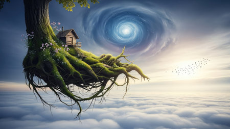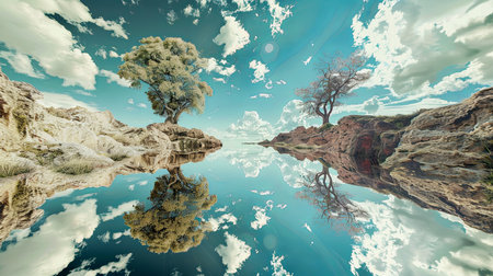 A surreal landscape featuring two trees on a floating island amidst clouds, depicting a dreamlike and serene atmosphere.