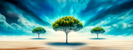 Surreal landscape with lush trees growing under cloudy sky