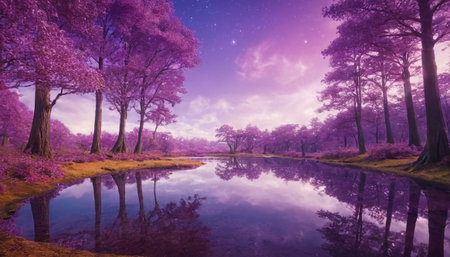 Magical purple forest with a lake and starry sky. Nature background
