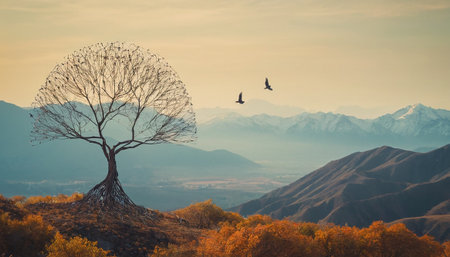 Beautiful autumn landscape with a lonely tree and a flock of vultures