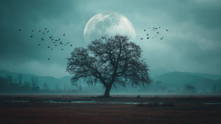 Explore the enchanting beauty of a tranquil landscape under a dramatic full moon, featuring a silhouetted tree, birds, and misty atmosphere.