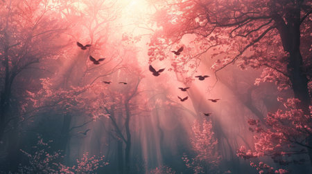 Birds soaring through a mystical pink forest, illuminated by soft rays of light, creating an enchanting and serene atmosphere.