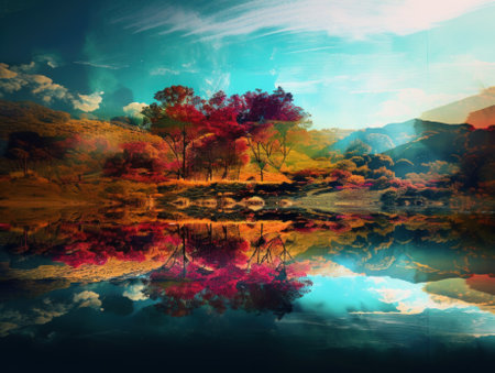 An AI generated illustration of a river flowing through a colorful landscape in autumn