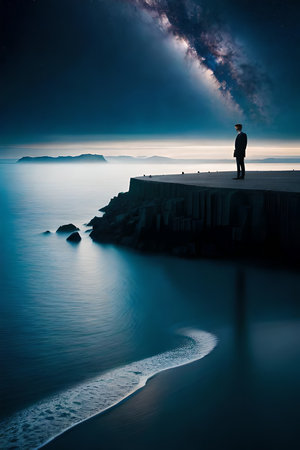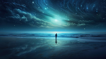 Dreamy surreal landscape with starry night sky and man silhouette.
