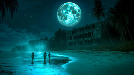 Group walking on beach at night with giant moon fantasy scene