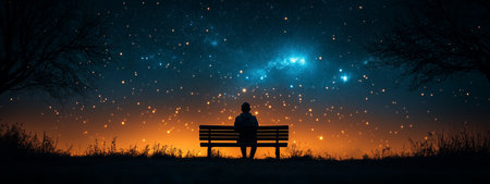 A solitary figure sitting on a park bench gazing at a starry night sky filled with glowing stars over a quiet landscape