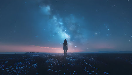 A woman stands alone in a vast open field under a starry night sky with a peaceful atmosphere.