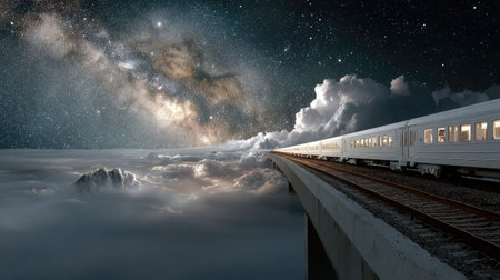 An enchanting scene of a train traveling through clouds, surrounded by a breathtaking night sky filled with stars and the Milky Way.