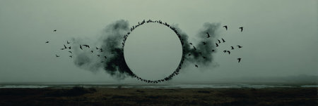 A broken circle of breathing guides dissolves into silence as take birds flight in a quiet, misty landscape during the evening hours.