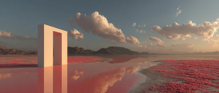 A striking surreal landscape with a white rectangular frame reflecting on pink water at sunset surrounded by mountains and clouds.